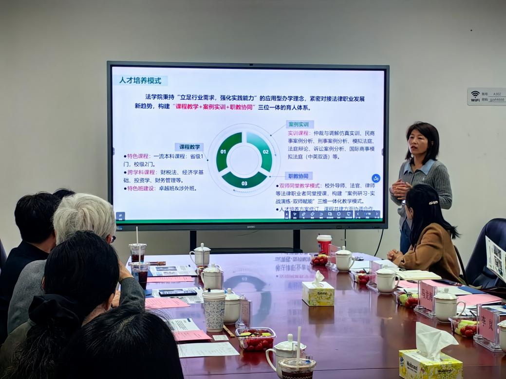法学院叶秀副院长系统介绍了学院概况、人才培养目标、模式和成效。她表示,学院始终注重理论与实践相结合,持续优化课程体系,强化实训教学,致力于培养适应社会需求的高素质应用型法律人才,面对教育国际化的趋势,学院积极拓展对外交流,期待通过与韩国东亚大学等高水平院校的合作,进一步丰富学生的学习体验与职业发展可能,共同推动法学教育的创新发展。
