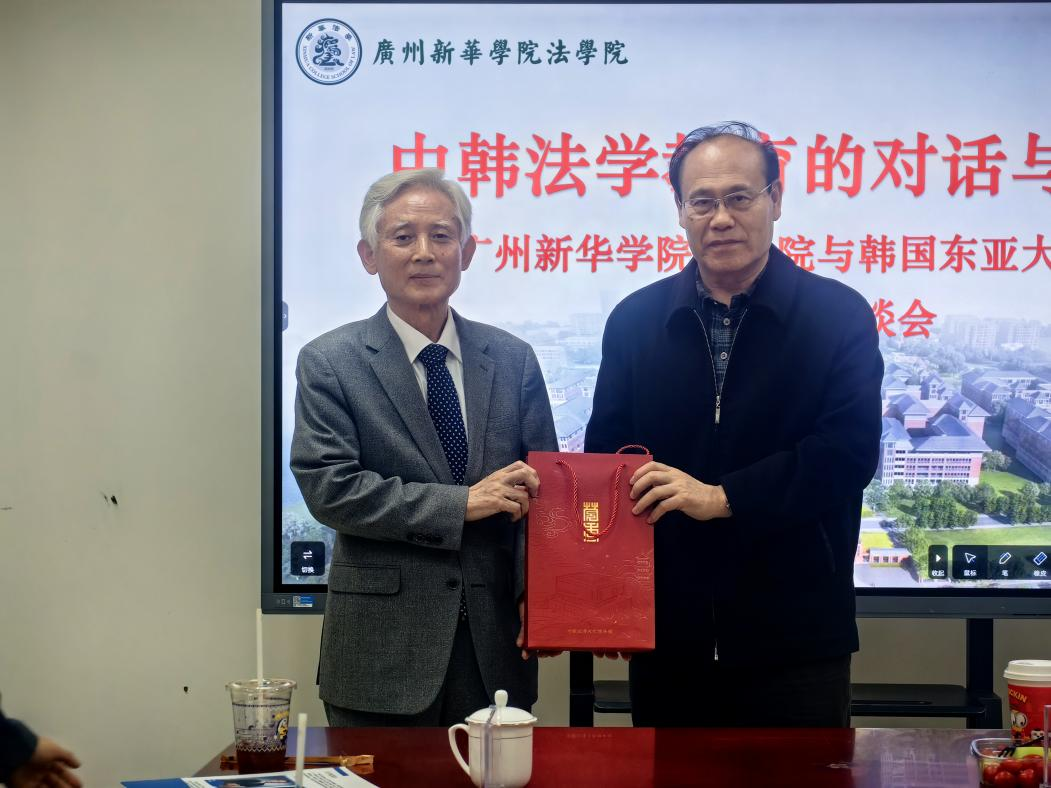 会议特设简约而隆重的礼物互赠环节。韩国东亚大学研究生院法学系赵东济教授作为代表向我院赠送了由其学生编撰的法学书籍,既体现了学术传承的厚重,也承载着青年学子的思想活力;我校马龙海副校长作为代表回赠岭南文化瑰宝“莞香”,象征两校情谊绵长、合作如香远播。双方互赠的礼品,不仅蕴藏各自的人文特色,更寄托了对友谊恒久、协作共赢的深切祝愿。