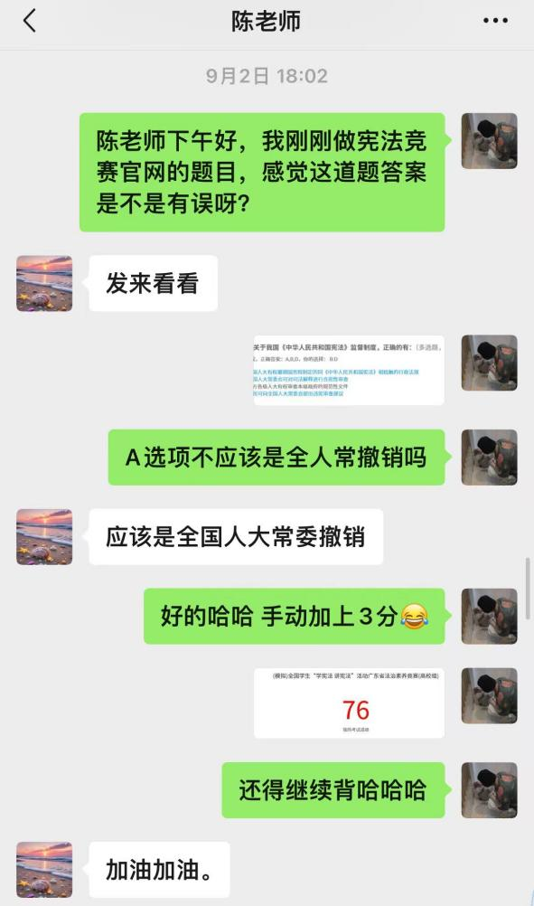 近日,由广东省教育厅主办的“第十届广东省学生‘学宪法 讲宪法’活动之法治素养竞赛”顺利落幕。在我院陈华丽老师、罗靖仪老师的指导下,吴镇全同学沉着应赛,凭借扎实的法治知识基础和良好的综合素养,最终荣获高校组优秀奖。