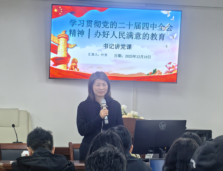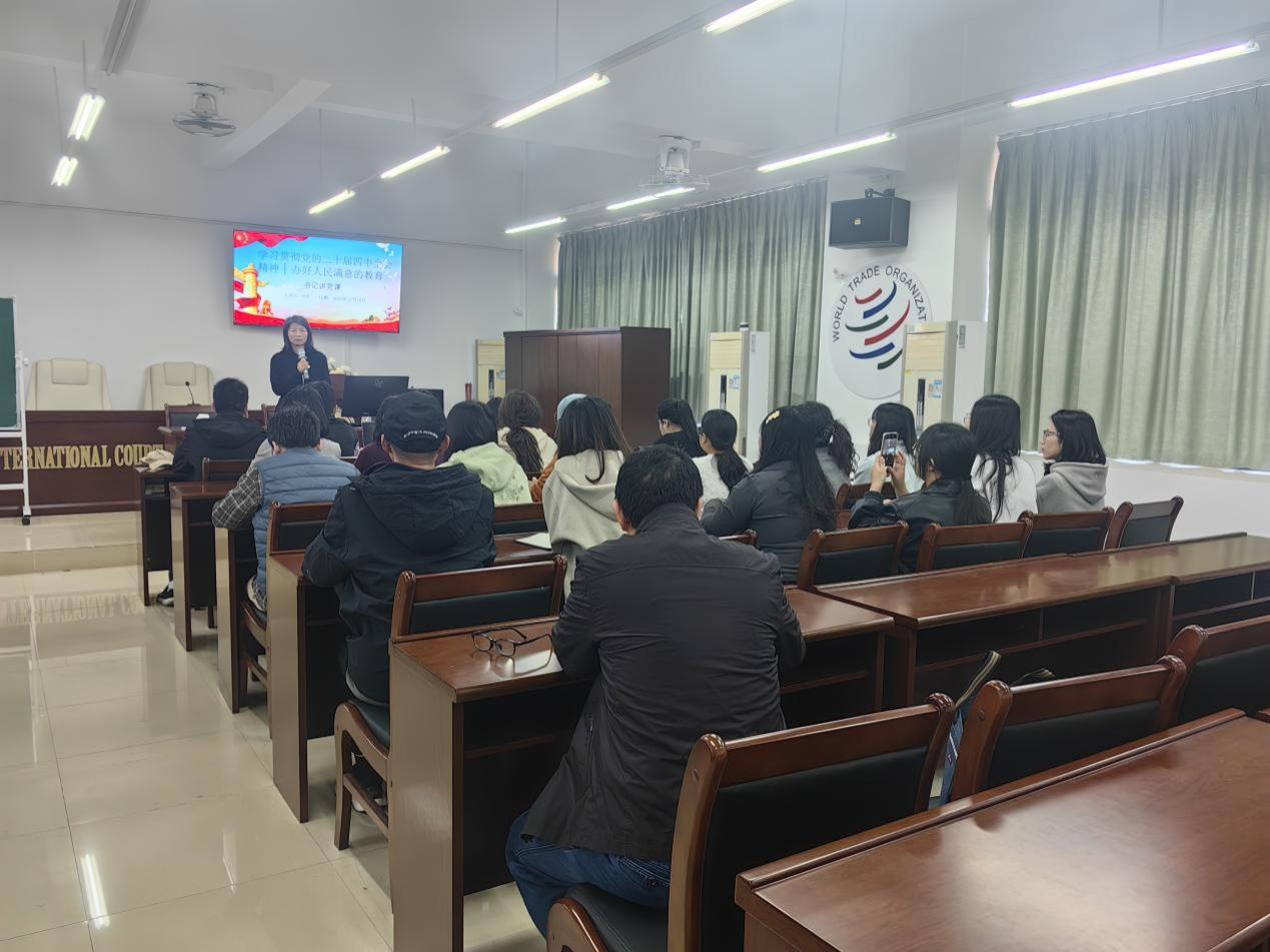 为深入学习贯彻党的二十届四中全会精神,切实把思想和行动统一到党中央决策部署上来,扎实推进法学教育事业高质量发展,2025年12月18日,法学院教工党支部组织开展“学习贯彻党的二十届四中全会精神,办好人民满意的教育”专题党课活动。本次党课由教工党支部书记叶秀主讲,全体党员教师参加学习并展开深入研讨。