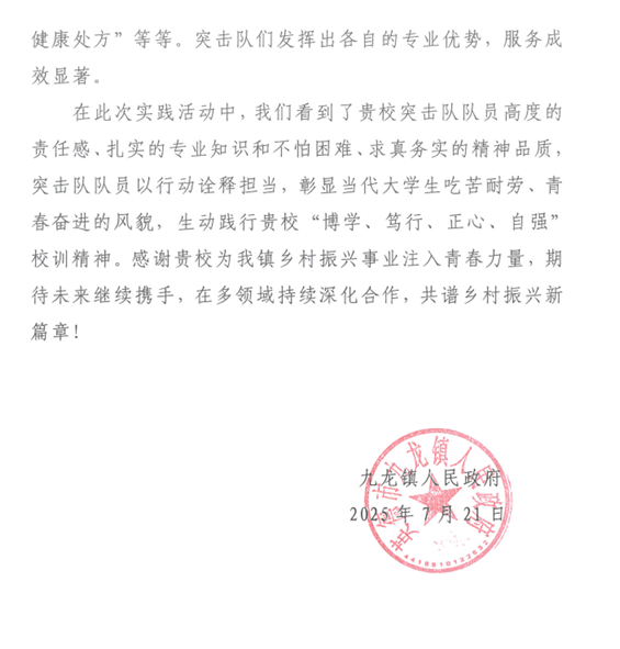 活动成效显著,九龙镇党委副书记吴书记在活动结束当天的座谈中,结合基层治理经验与队员们深入交流,分享乡村法治建设的实践心得与发展思路。镇政府发来的感谢信更是赞誉队员们 “用专业与热忱展现当代大学生担当”。实践地及国家级媒体的报道,让这份跨越两年的乡村法治实践被更多人知晓。