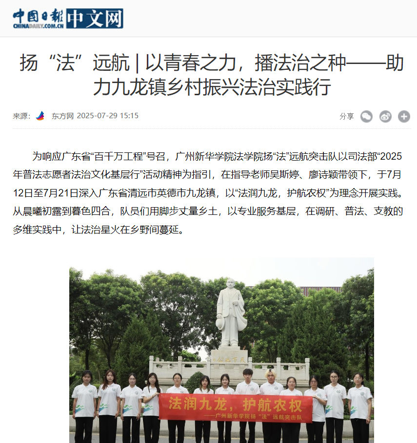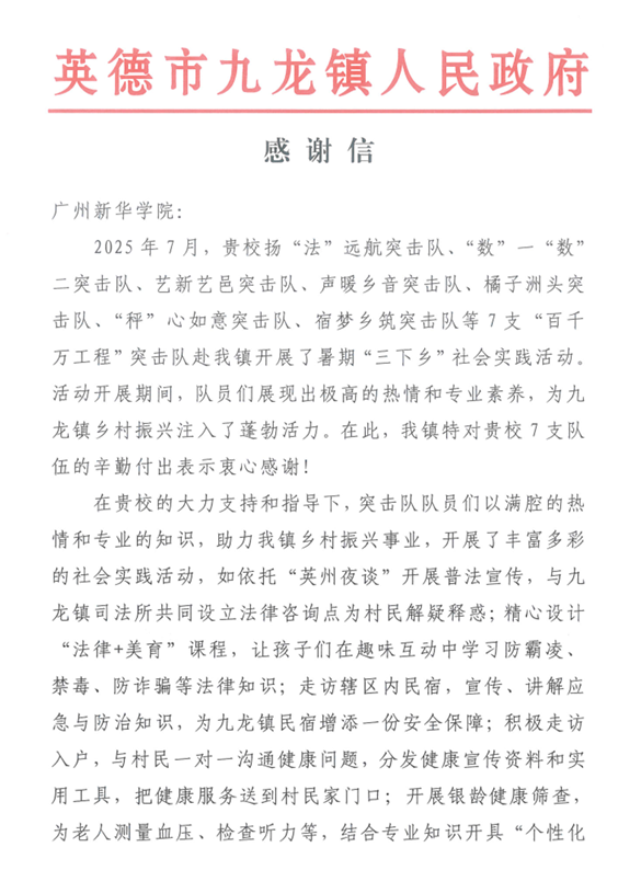 近日,我院扬“法”远航突击队收到中国共产主义青年团英德市九龙镇委员会发来的感谢信,信中对突击队赴英德市九龙镇开展暑期“三下乡”社会实践的扎实行动与显著成效给予高度认可,字里行间满是真挚赞誉。