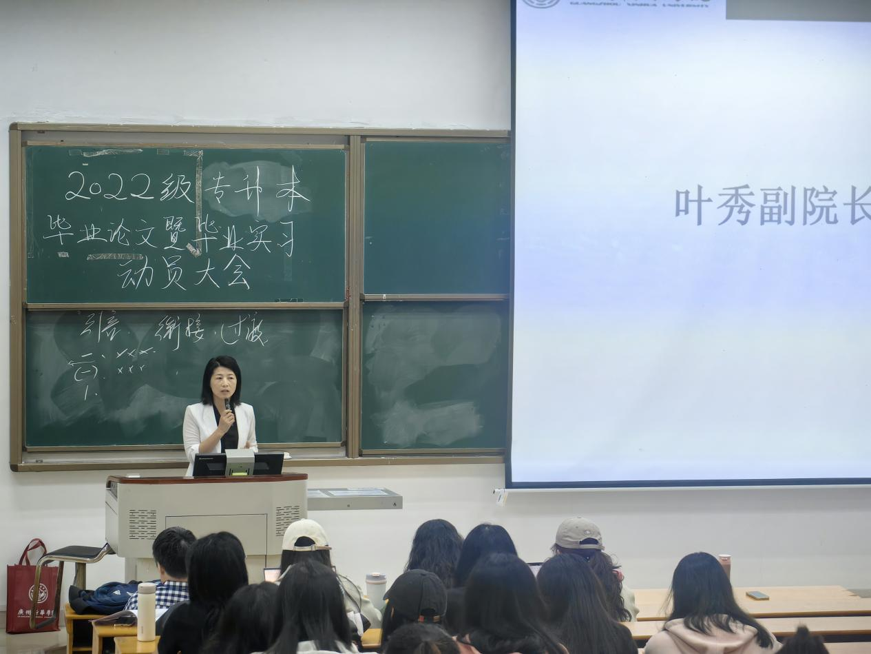 在2022级专升本毕业生的动员环节,叶秀副院长作了同样深入的动员讲话。她指出,实习是融入职业环境的关键一步,论文则是学术能力与专业素养的集中呈现,二者共同构成同学们迈向更高发展平台的重要基石。她希望同学们珍惜这一阶段的锻炼机会,在实践中巩固知识,在研究中提升能力。叶秀副院长对专升本同学提出五项期望:一要高度重视、全情投入,协调好实习工作与论文写作的节奏,做到“两手抓、两不误”;二要尽快完成从学生到实习生的角色转换,在实践中学习、在岗位上成长,真正做到知行合一;三要立足实际、关注现实问题,从实践场景中提炼论文选题,增强研究的针对性与应用性;四要恪守学术诚信,注重逻辑严谨与表达规范,在论文中体现独立思考与扎实功底;五要主动沟通、善用资源,积极向指导老师和带教老师请教,在互动中提升专业能力与综合素养。她最后寄语全体同学:“愿你们以沉静之心面对挑战,以扎实之行书写成长,最终丰收归来、平安归来、顺利毕业!”