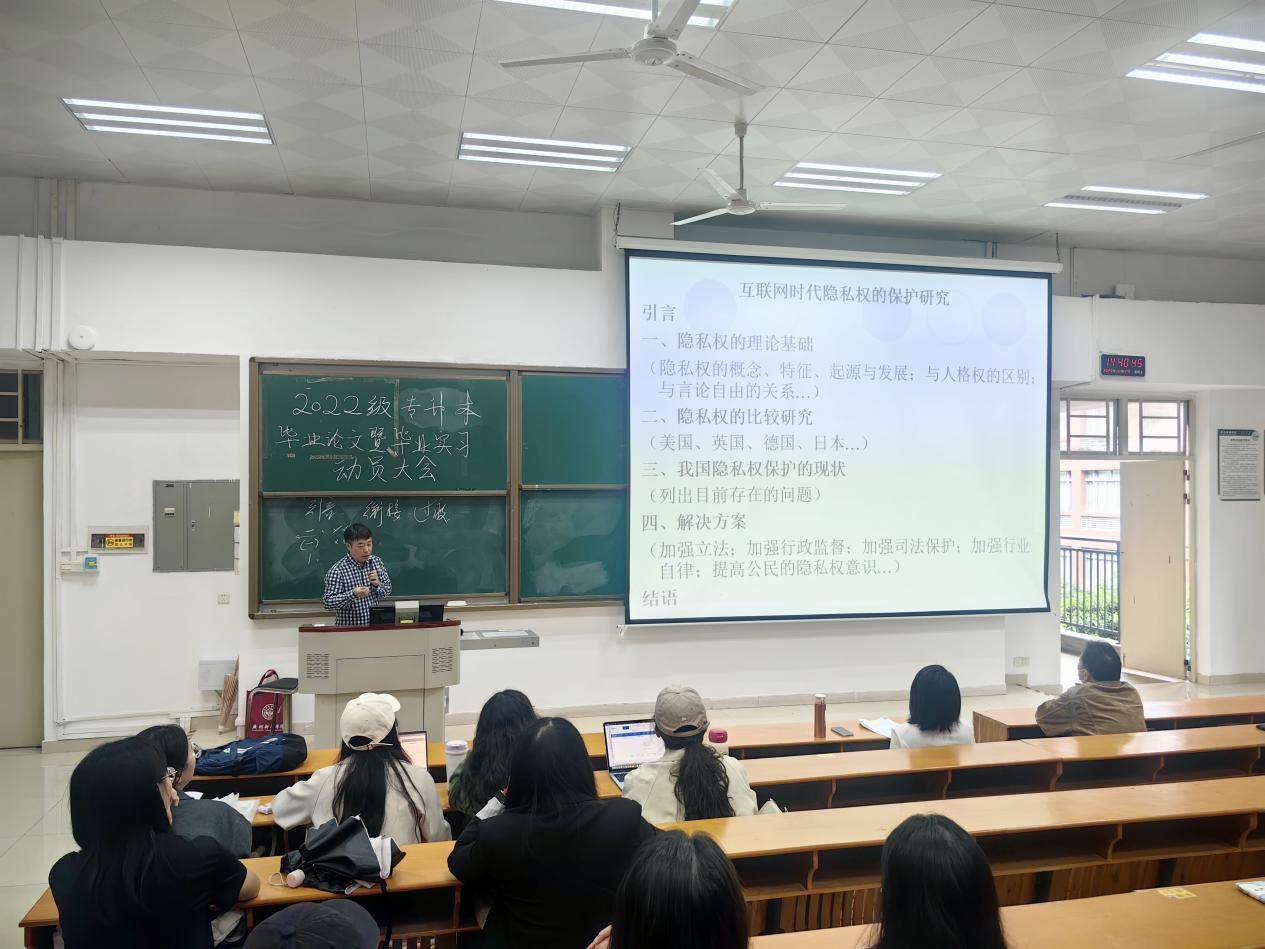 我院2022级631名大四学生的毕业实习暨毕业论文动员大会于2025年10月22日在定静楼2D403顺利举行。法学院执行院长李岚教授、副院长叶秀副教授、教研室主任廖诗颖、论文写作指导老师杨铁铮以及专职教师、年级辅导员、班主任和2022级全体学生参加了本次动员大会。会议旨在引导同学们深刻认识毕业论文与毕业实习的重要性,明确任务方向,为顺利完成学业、顺利就业奠定坚实基础。