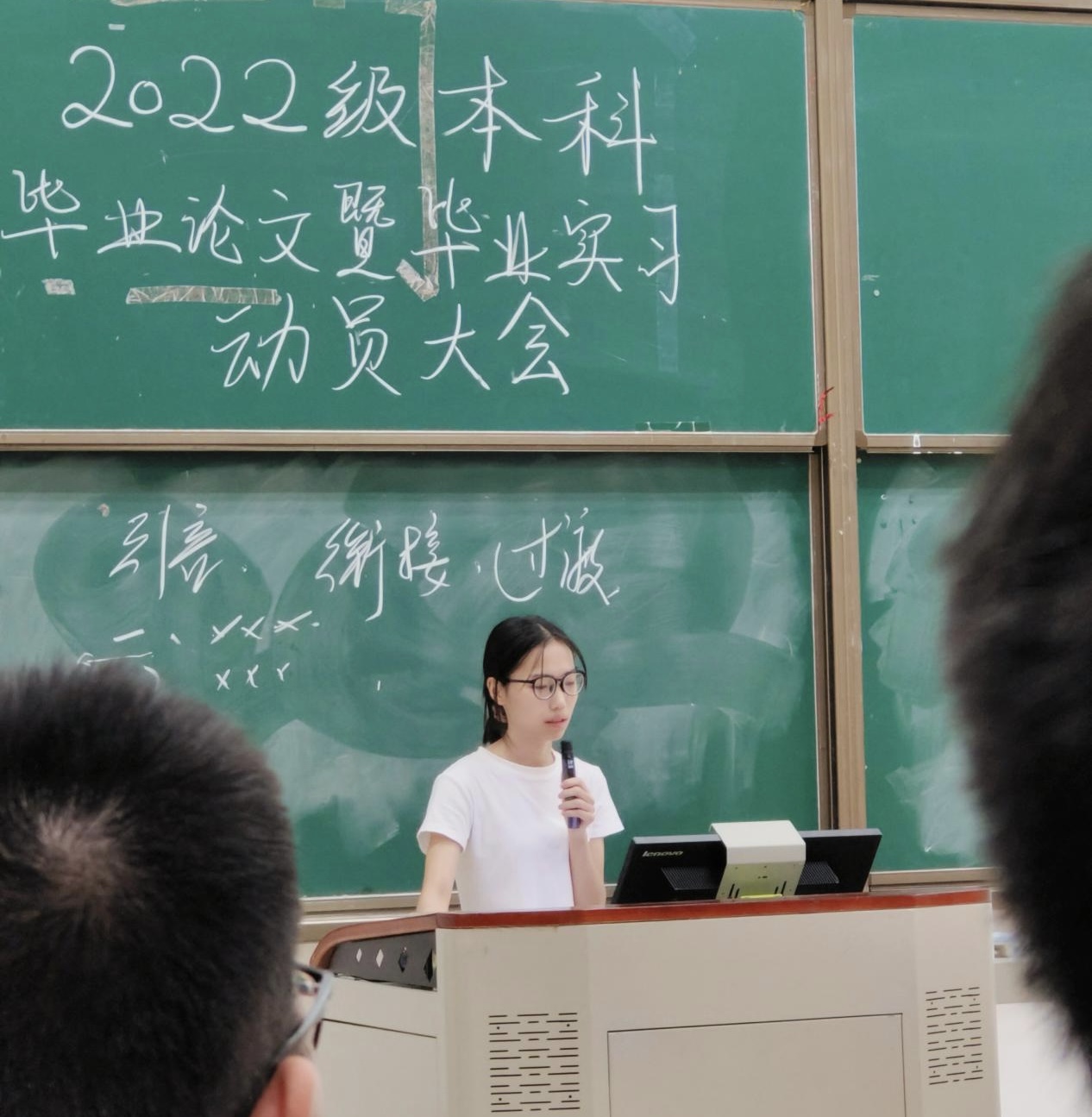 在大会的最后环节,杨世花老师详细阐述论文和实习的相关事项,对论文选题、初稿、定稿、论文进度安排等问题作了具体安排与布置,吴泽老师就实习材料提交、实习注意事项等具体事宜作了详细说明与布置,并祝愿全体同学顺利完成毕业实习和毕业论文任务。