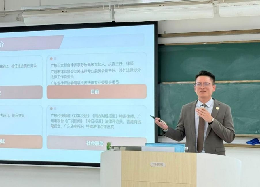 10月15日下午,法学院举办了以特色班学生学业规划、涉外实践与职业发展路径为主旨的专题讲座。本次活动由陈华丽副院长主持,特别邀请广东正大联合律师事务所高级合伙人、执行主任、第十一届广州市律师协会涉外法律业务专业委员会副主任刘志浩律师作为主讲嘉宾,为我院师生带来了题为“迈向世界舞台:涉外律师的发展蓝图”的精彩分享。广东正大联合律师事务所合伙人、团支部书记、法学院校友会执行会长陈俊霖律师,赖炳健律师,法学院院长李正华教授,党总支书记、执行院长李岚教授,出席了本次活动。