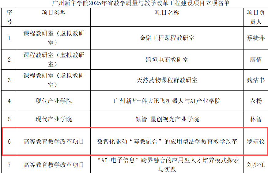 近日,广东省教育厅正式公布了2025年度本科高校教学质量与教学改革工程建设项目立项名单(粤教高函〔2026〕4号)。在学校获批的14项省级建设项目中,我院法学院罗靖仪老师主持申报的高等教育教学改革项目《数智化驱动“赛教融合”的应用型法学教育教学改革》成功获得省级立项。